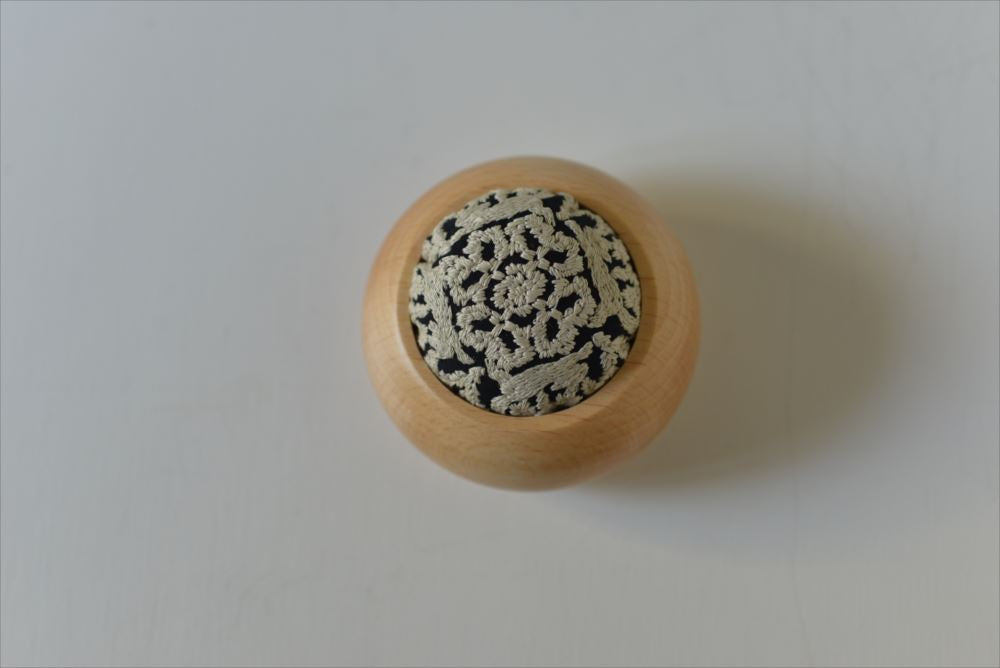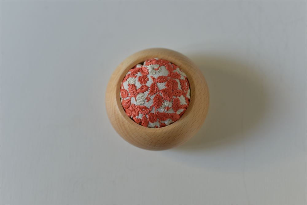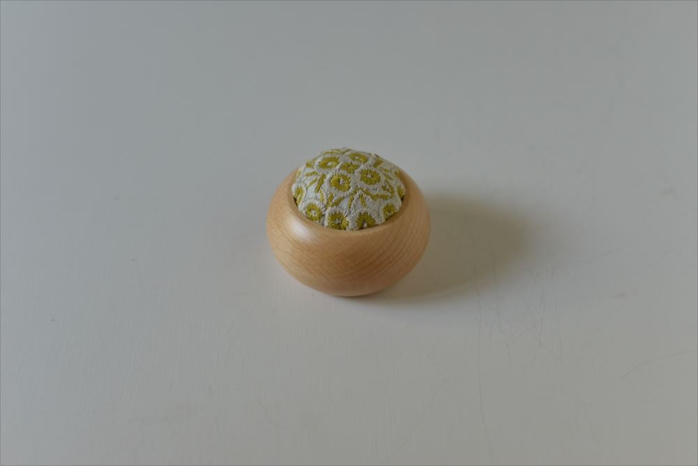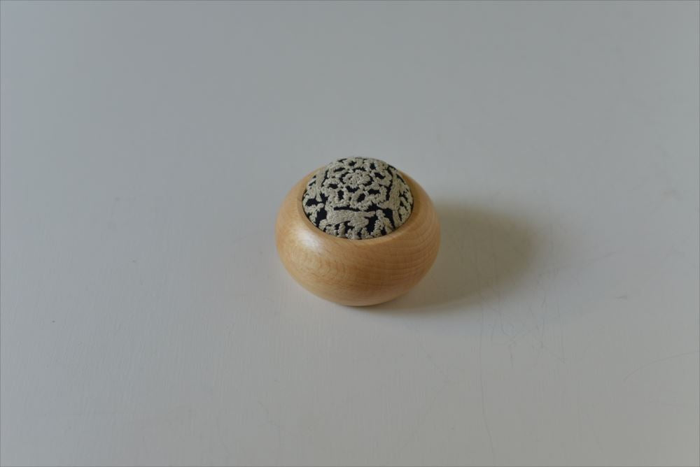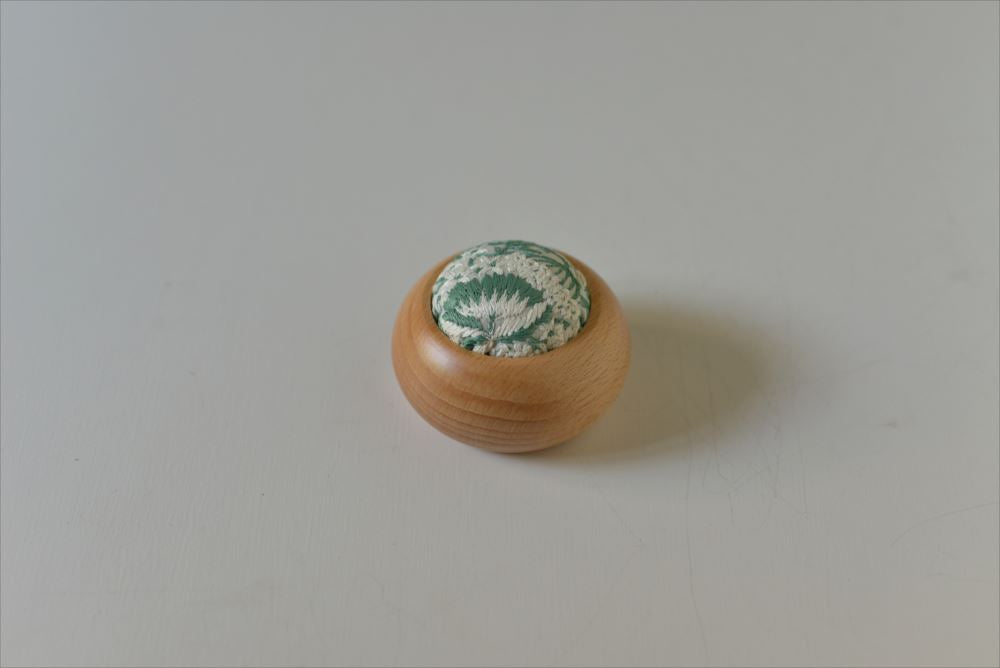 The base of the pin cushion is made from beech wood, cut, smoothed and polished to a neat rounded bowl.