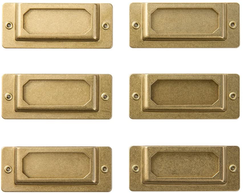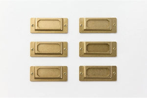 Desde la compañía de viajeros, estos son placas de etiquetas de latón para atornillar a cajones o bandeja de clasificación de papel de cartón o un álbum unido duro a bordo, madera o cuero. Las etiquetas de papel se insertan en la pieza para nombrar los contenidos.