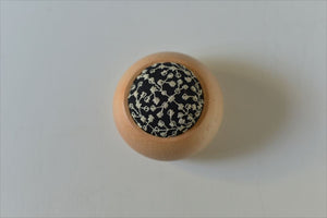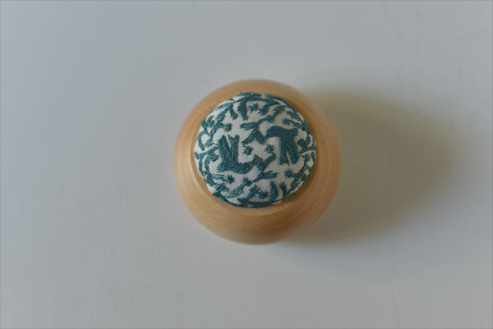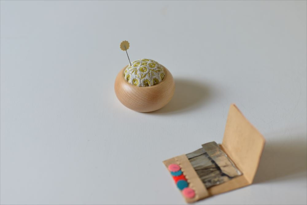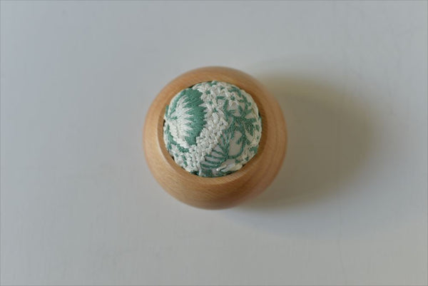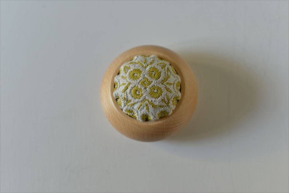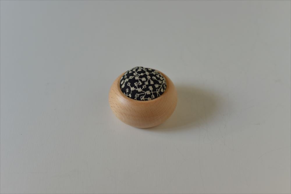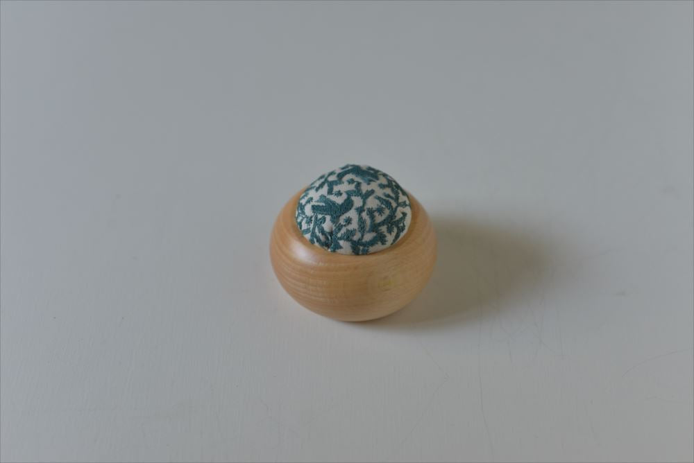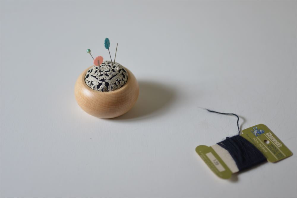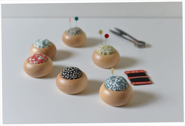 The base of the pin cushion is made from beech wood, cut, smoothed and polished to a neat rounded bowl.