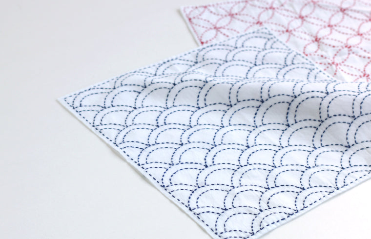 El sashiko tradicional usa hilo oscuro en la marina marina o blanca, pero el emparejamiento con rosca rosa, rojo o verde puede agregar una dimensión fresca al diseño simétrico.