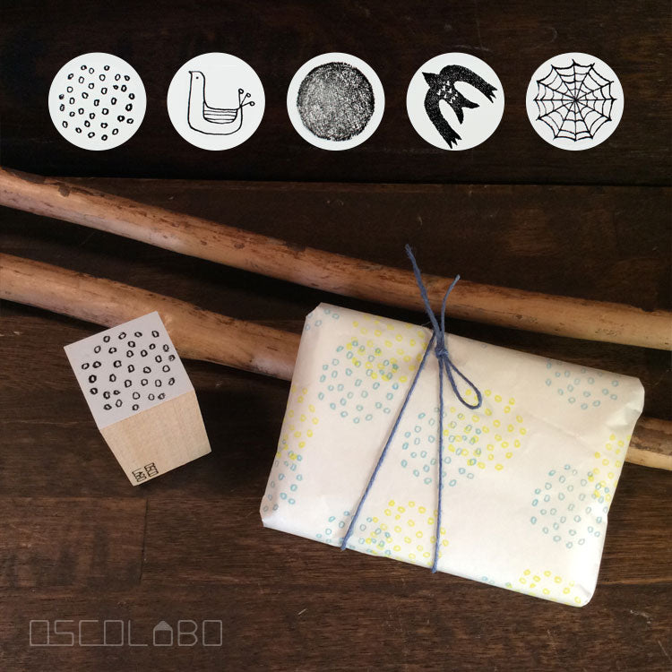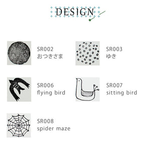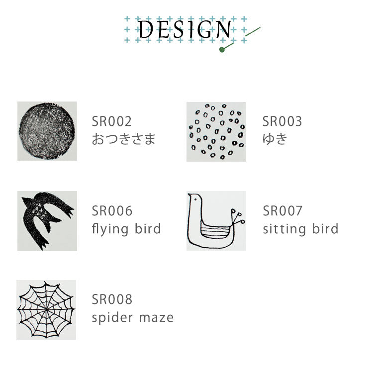 La serie Sola Moiyo presenta sellos individuales con las imágenes: Web de araña, ave voladora, pájaro sentado, pequeños puntos.