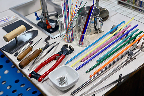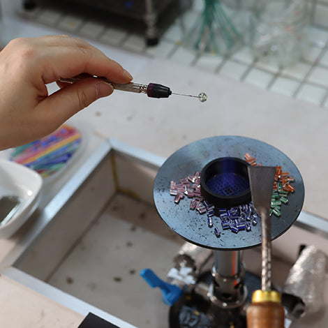 Son producidos por los trabajos de las cuentas de las plantas. Habiendo sido atraído en el mundo de las cristalería, los fundadores establecieron un taller de vidrio en Kokubunji, Tokio en 2011. Mientras crea varios estilos de glasswork, las bolas de las plantas funciona, crearon una pieza para parecerse a las cuentas de Ohajiki de los juegos de niños tradicionales. Actualmente, la producción se realiza a través de un error y error con un enfoque en la creación de Ohajiki original. Los patrones y texturas delicados distintivos de Ohajiki se crean a partir de vidrio que cambian su apariencia en cada momento durante el proceso de disparo. Son verdaderamente el resultado de la artesanía. La base del pasador de marcado es una aguja de acero, que debe pasar fácilmente a través de la tela. Estos se hacen en Hiroshima, un área conocida por la producción de agujas de calidad.