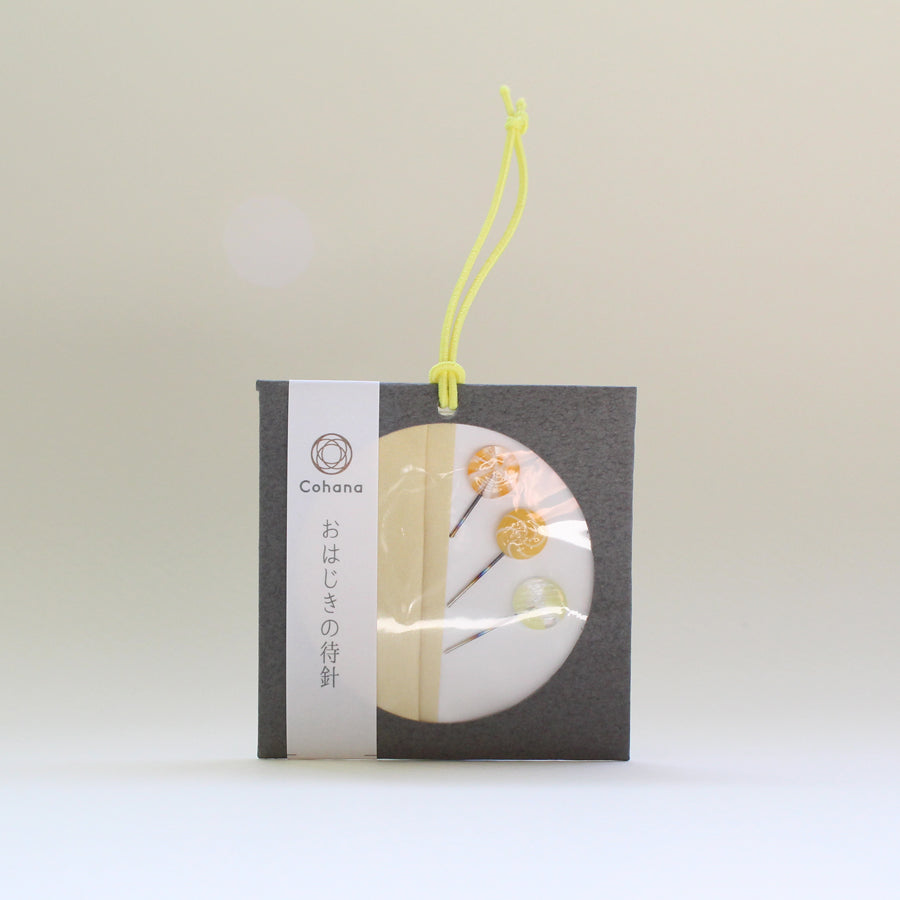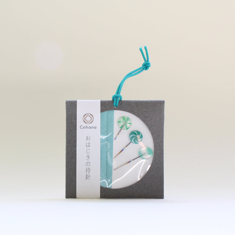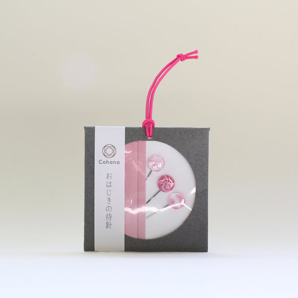 "Ohajiki" son piezas usadas en un juego que se ha jugado en Japón desde la antigüedad. Estos pasadores de marcado se hacen utilizando hermosos diseños de Ohajiki que evocan nostalgia por un tiempo anterior. Todo el Little Ohajiki, que se colorea en los tonos pastel se realiza cuidadosamente uno a la vez para hacer que cada pieza sea especial.