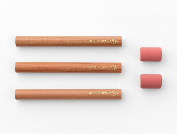 La recambio de lápiz es la recarga dedicada para el lápiz de madera y madera del viajero. Hay tres lápices, dos borradores y un conjunto de borrador.