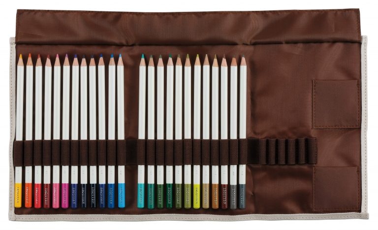 Está lleno de seis greens y siete azules para dibujar montañas, plantas y pilas. Con rosas y marrones también. Cada lápiz se desliza en una lengüeta por separado con las puntas protegidas con un pliegue de tela.