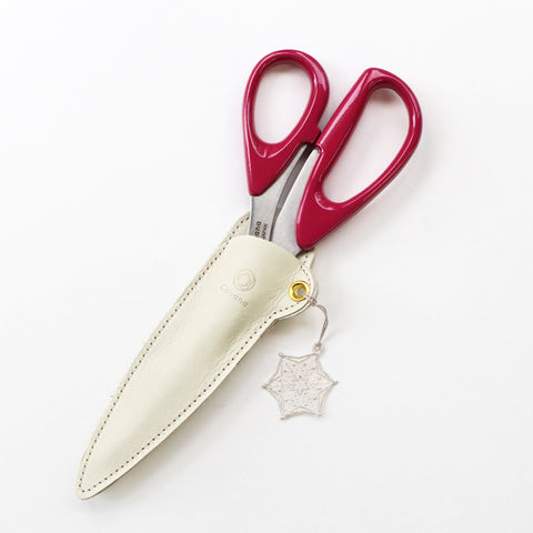 The high-quality white genuine leather scissor case, inspired by snow, comes with a snowflake charm.