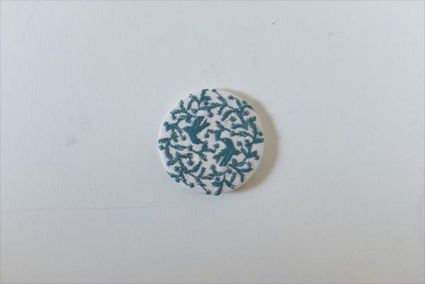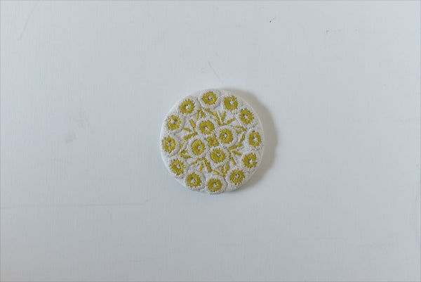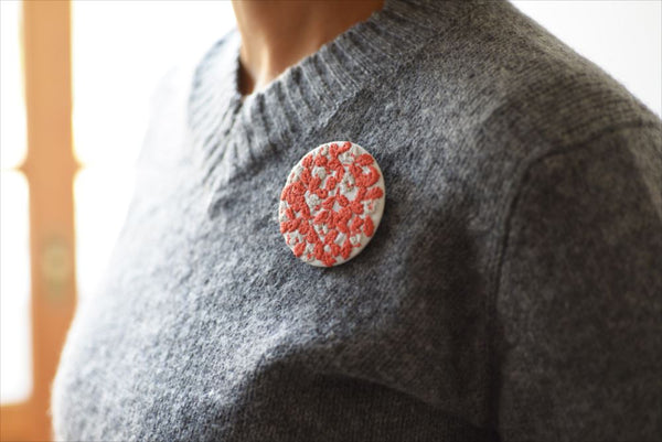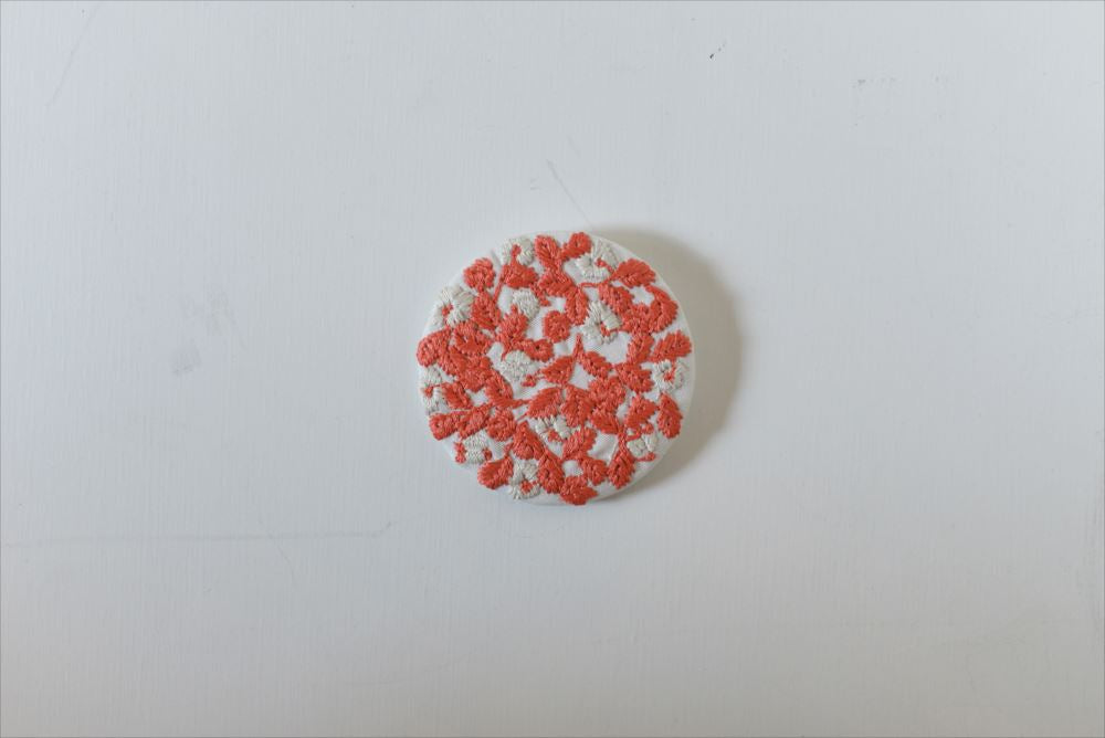 These pretty brooches feature the delicate embroidered panels by designer Rieko Oka. The patterns inspired by natural elements where she lives, use subtle, muted primary colours. She creates the patterns by hand, so the designs have an imperfect symmetry.