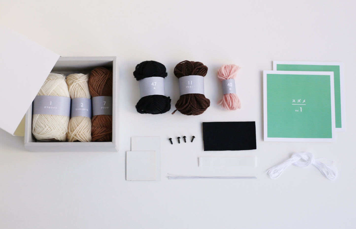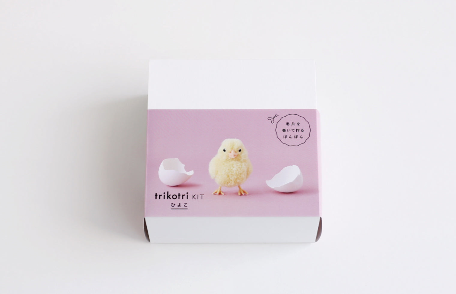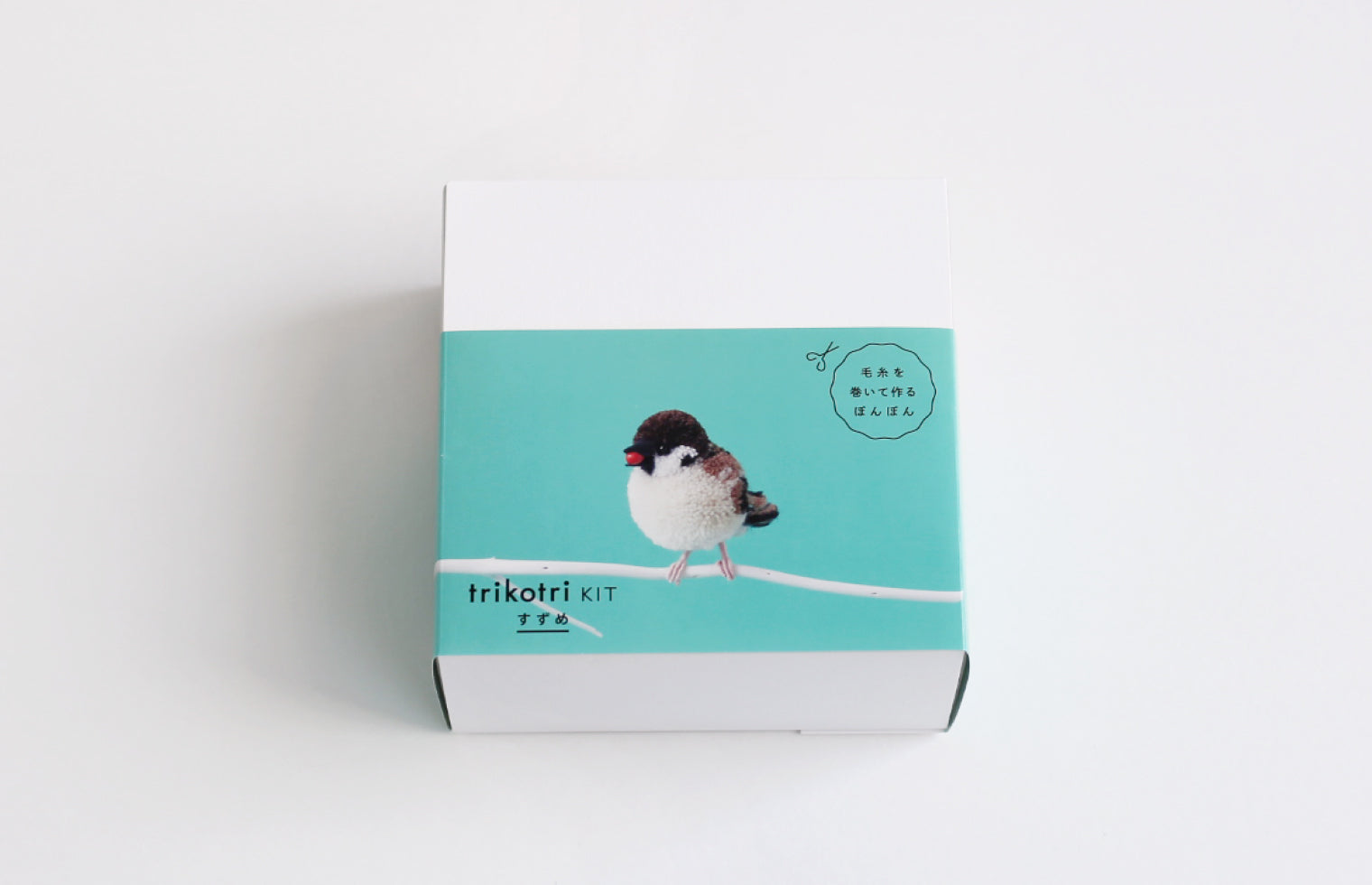 These kits are a collaboration between Daruma and the writer Trikotri, the author of "animal pompon" and "inu pompon" (published by Seibundo Shinkosha).* It's a kit of materials to make small animal toys from pom poms made from winding woollen yarn. Using Pom Pom Makers (35mm + 45mm), they are carefully cut and shaped to resemble a small bird.