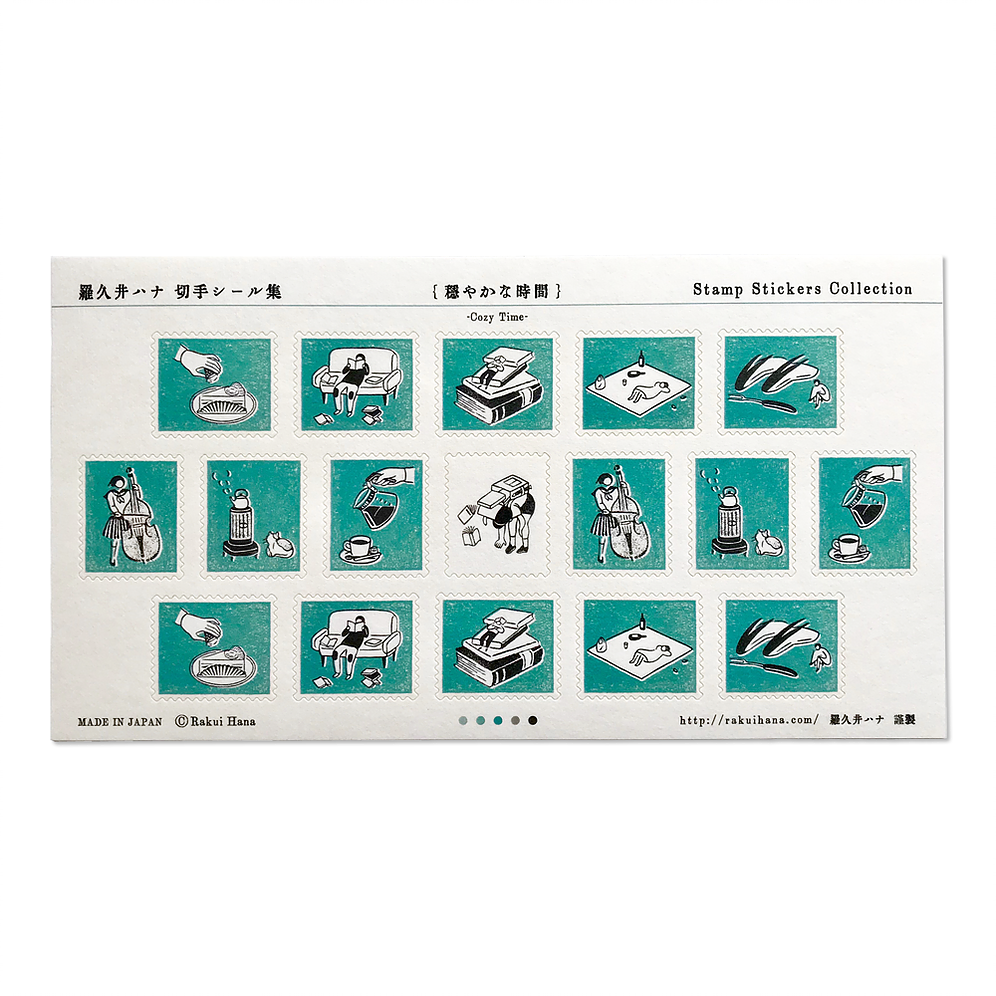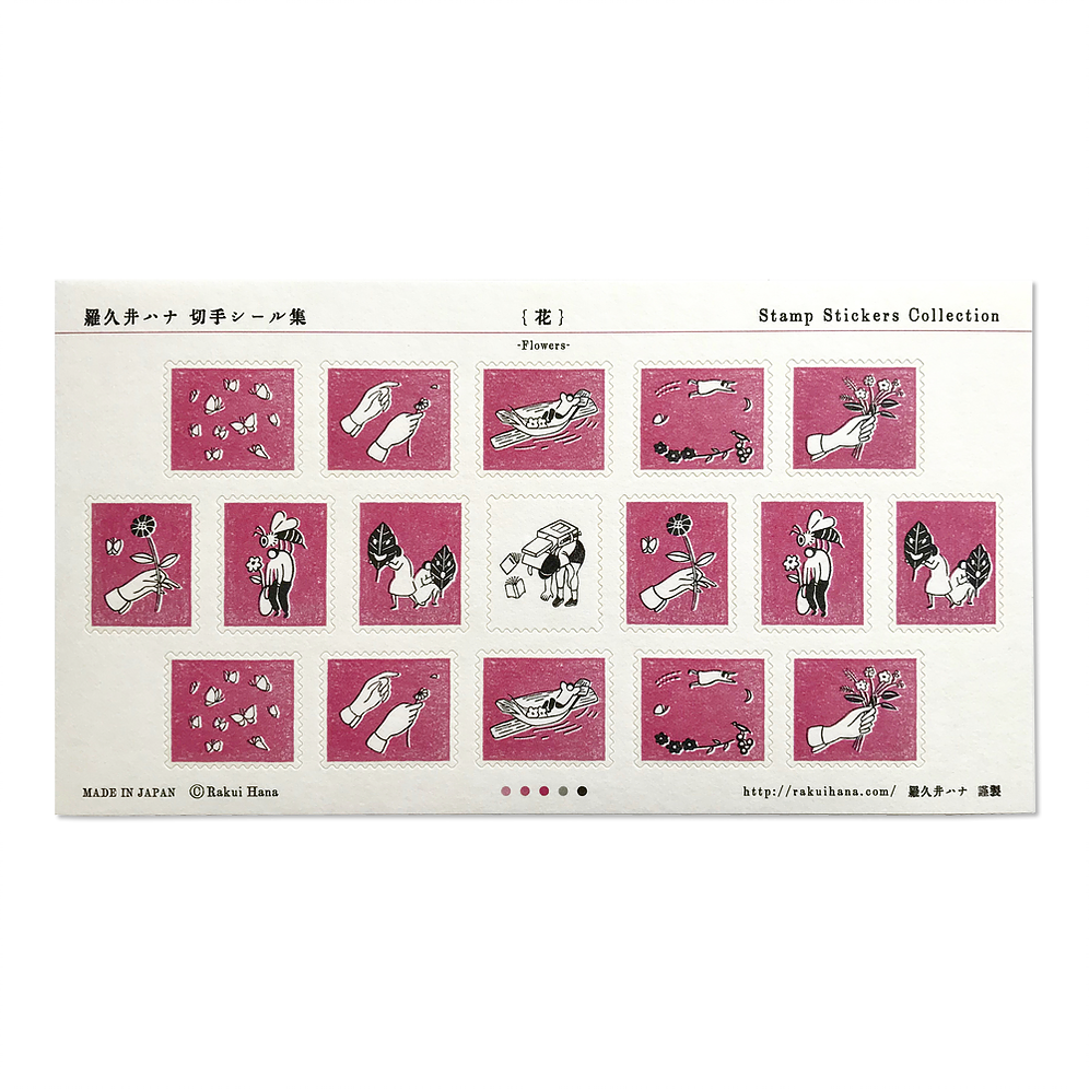 Rakui Hana is a designer of rubber and adhesive stamps. These adhesive stickers are in the shape of a stamp and add a playful decorative element to your gift wrapped parcels and hand written posted cards.